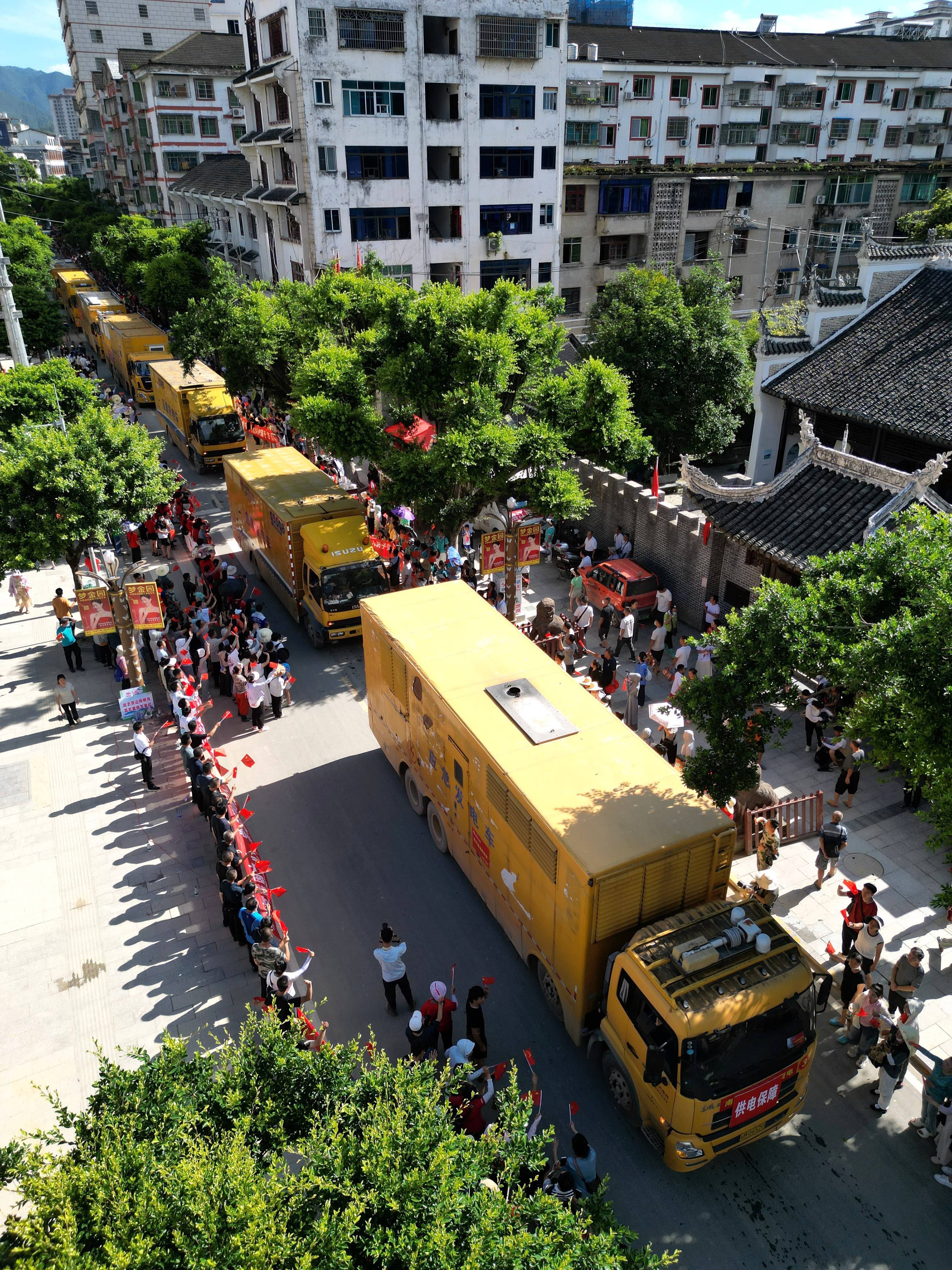 ↑7月3日,在贵州榕江县城,当地居民沿街送别救援队员(无人机照片)。车灯划破晨雾,救援车队缓缓驶来。顷刻间,人潮涌动。