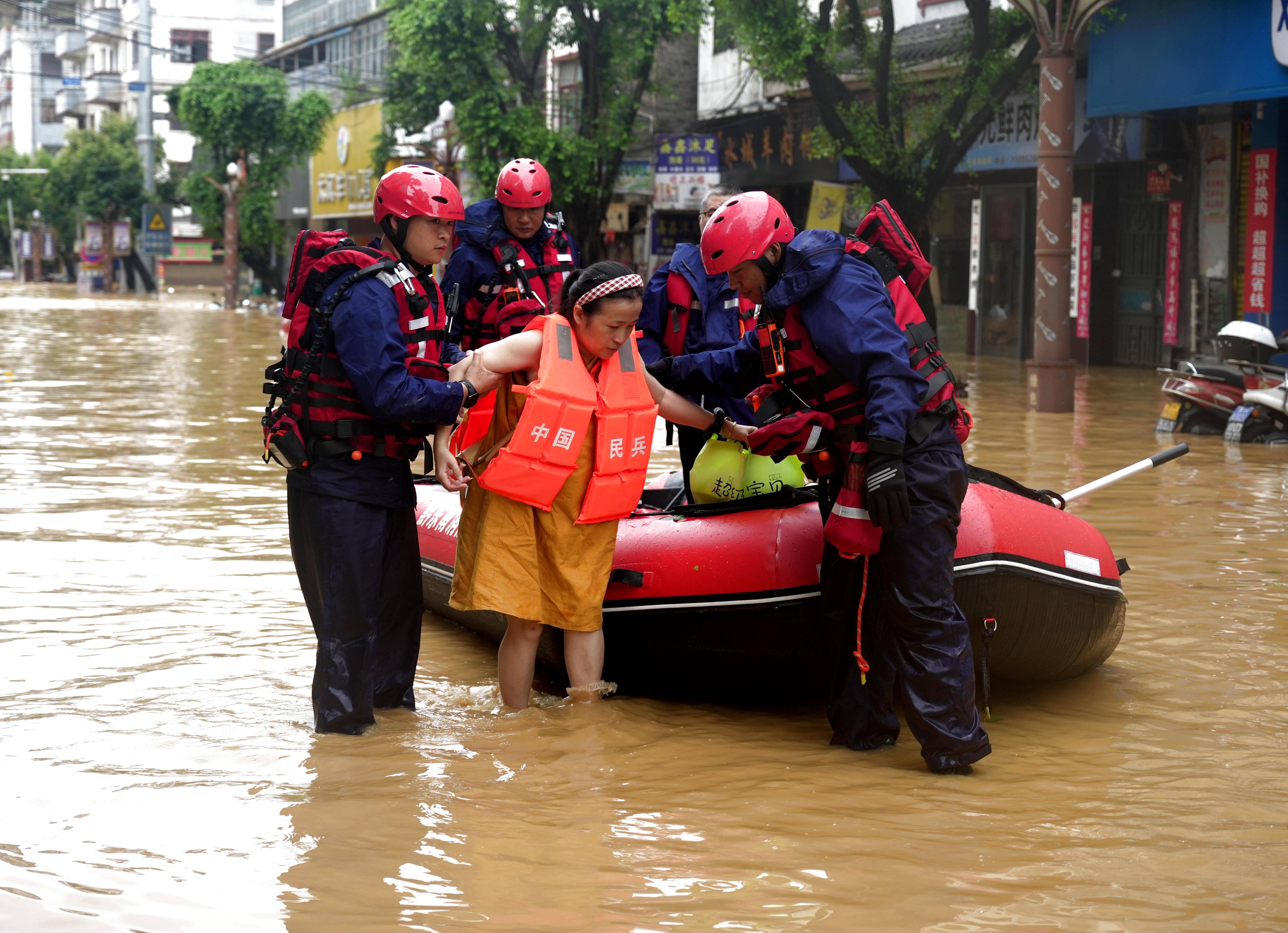↑6月24日,救援人员在贵州榕江县城转移群众。林进标:孝亲守乡的青春答卷