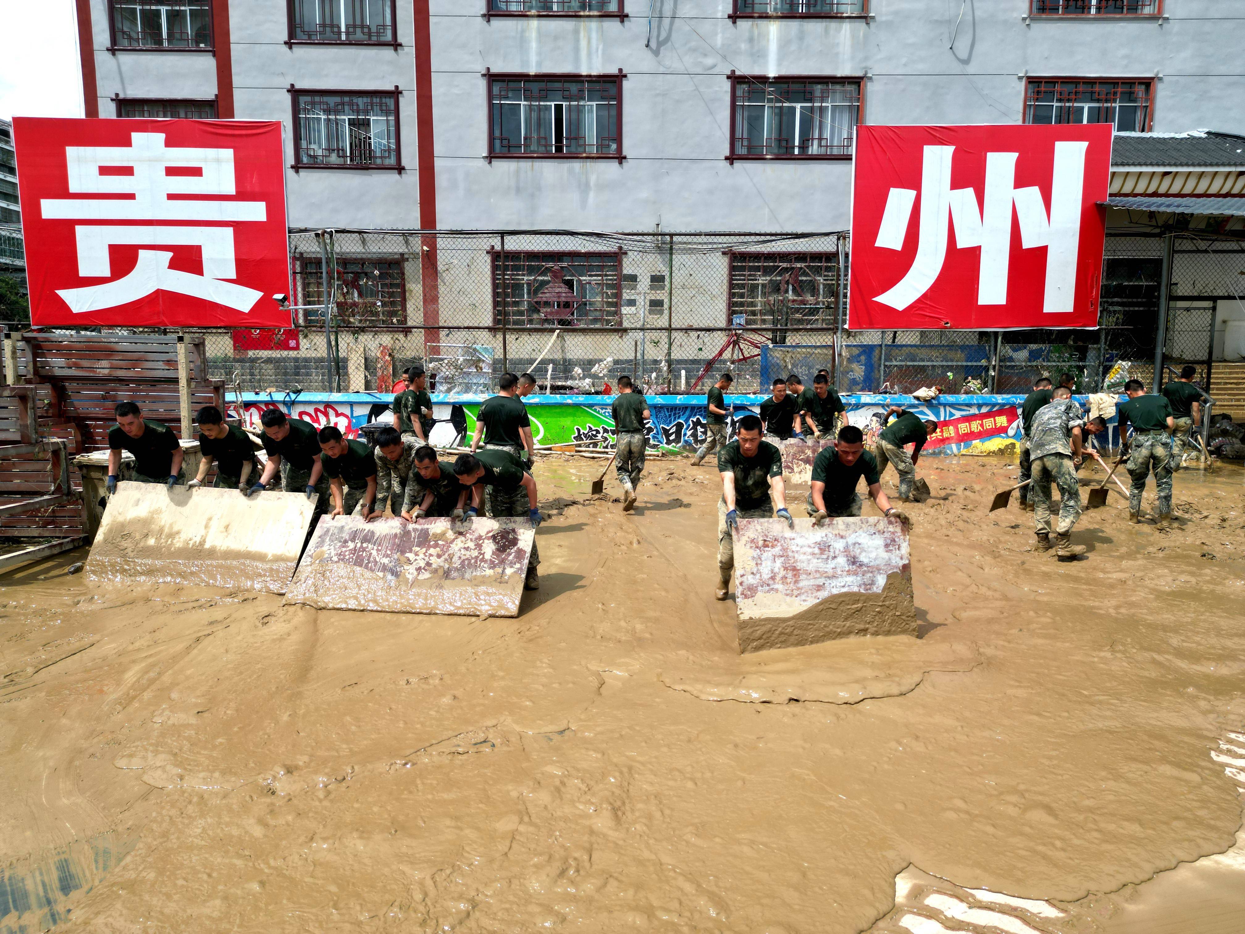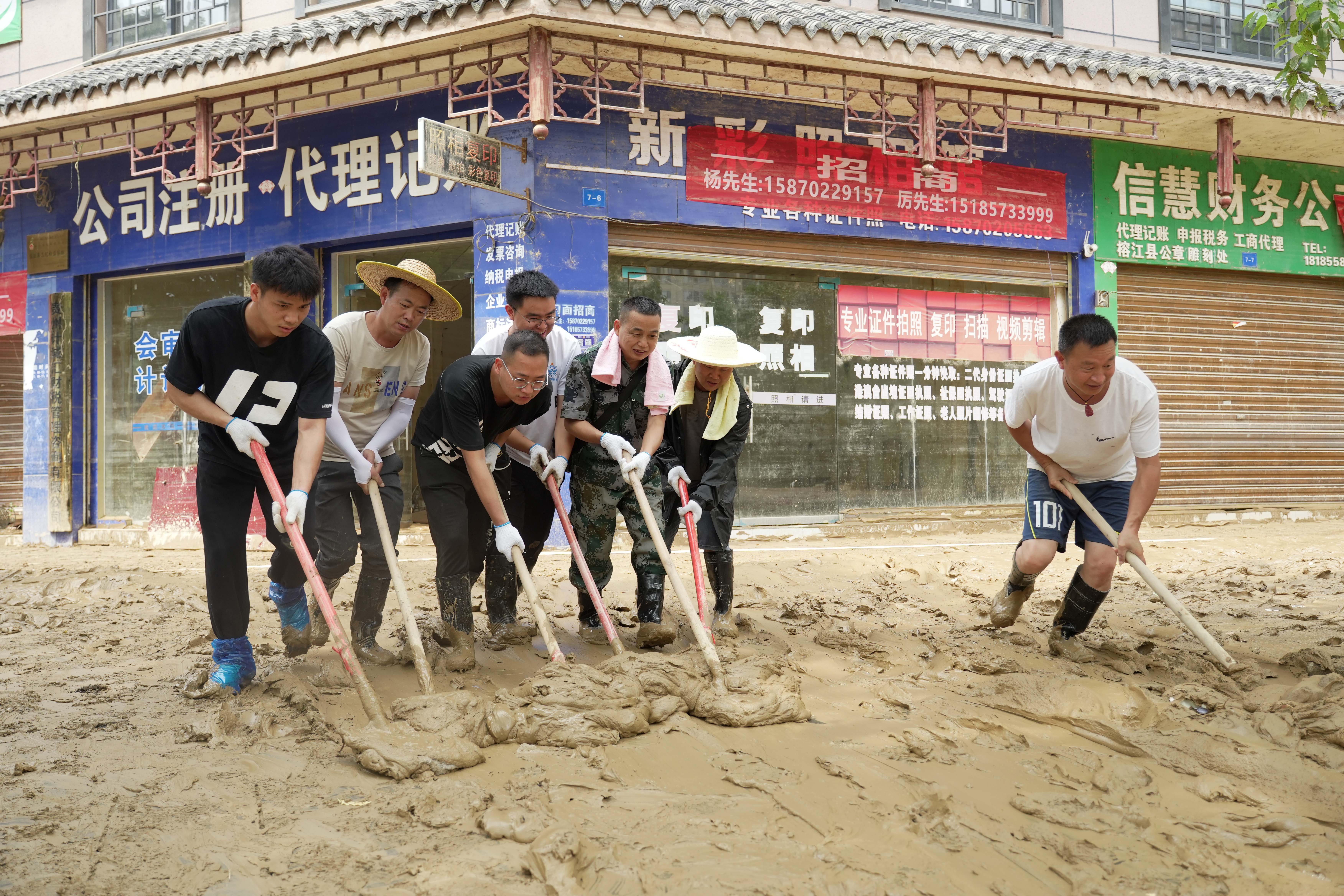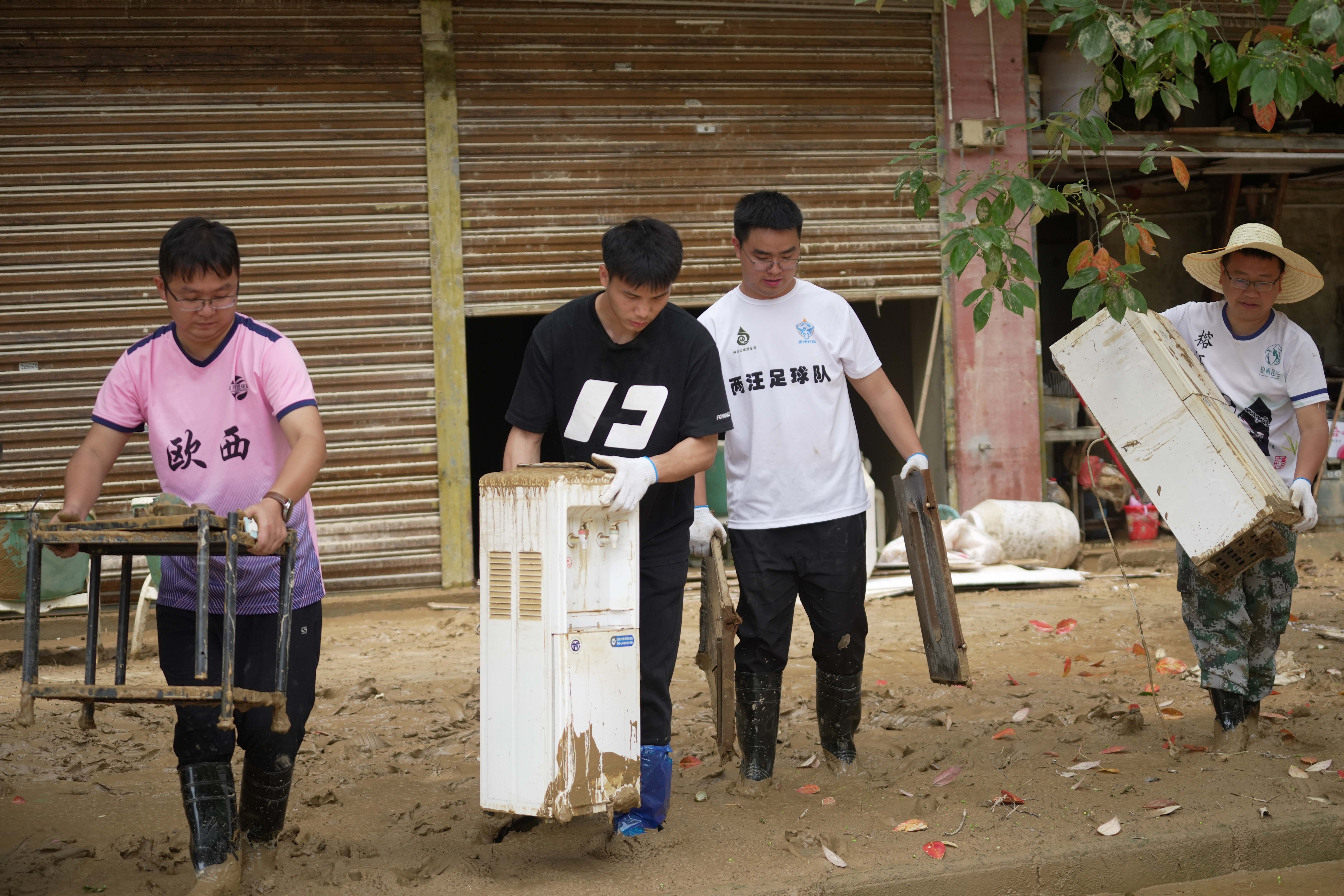 ↑6月26日,林进标(左一)在贵州榕江县城参加清淤。