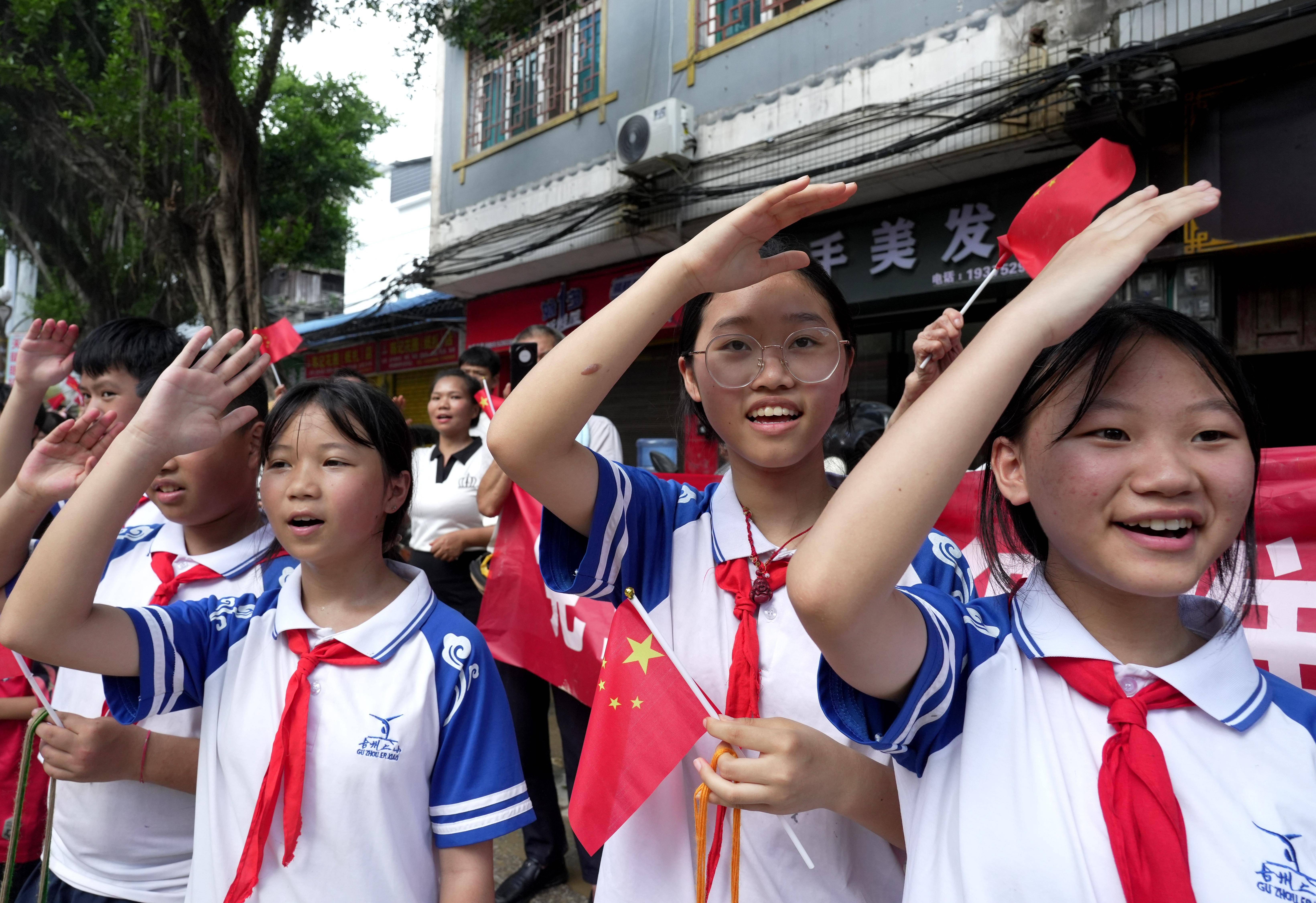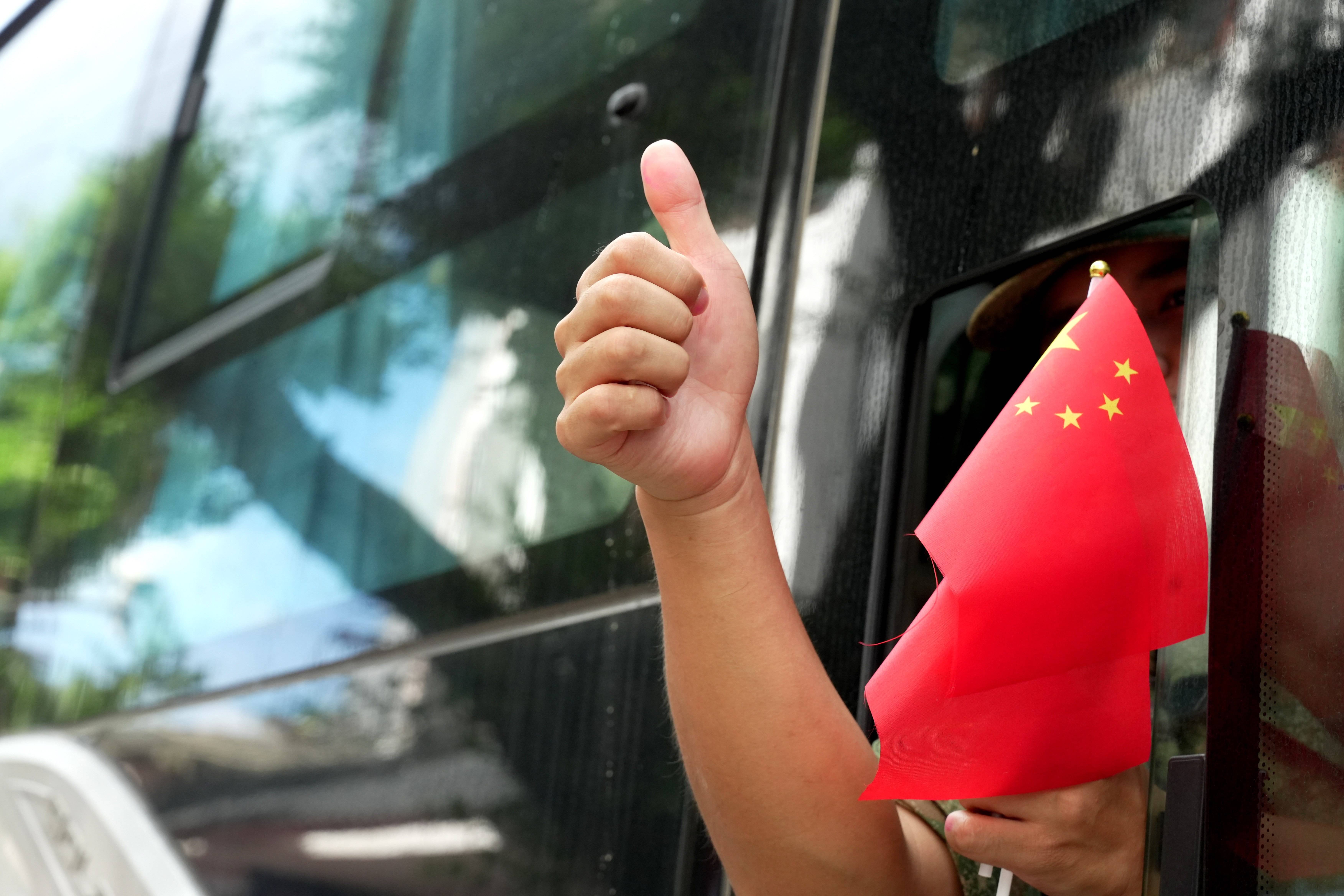↑7月3日,在贵州榕江县城,当地居民沿街欢送救援队伍返程。