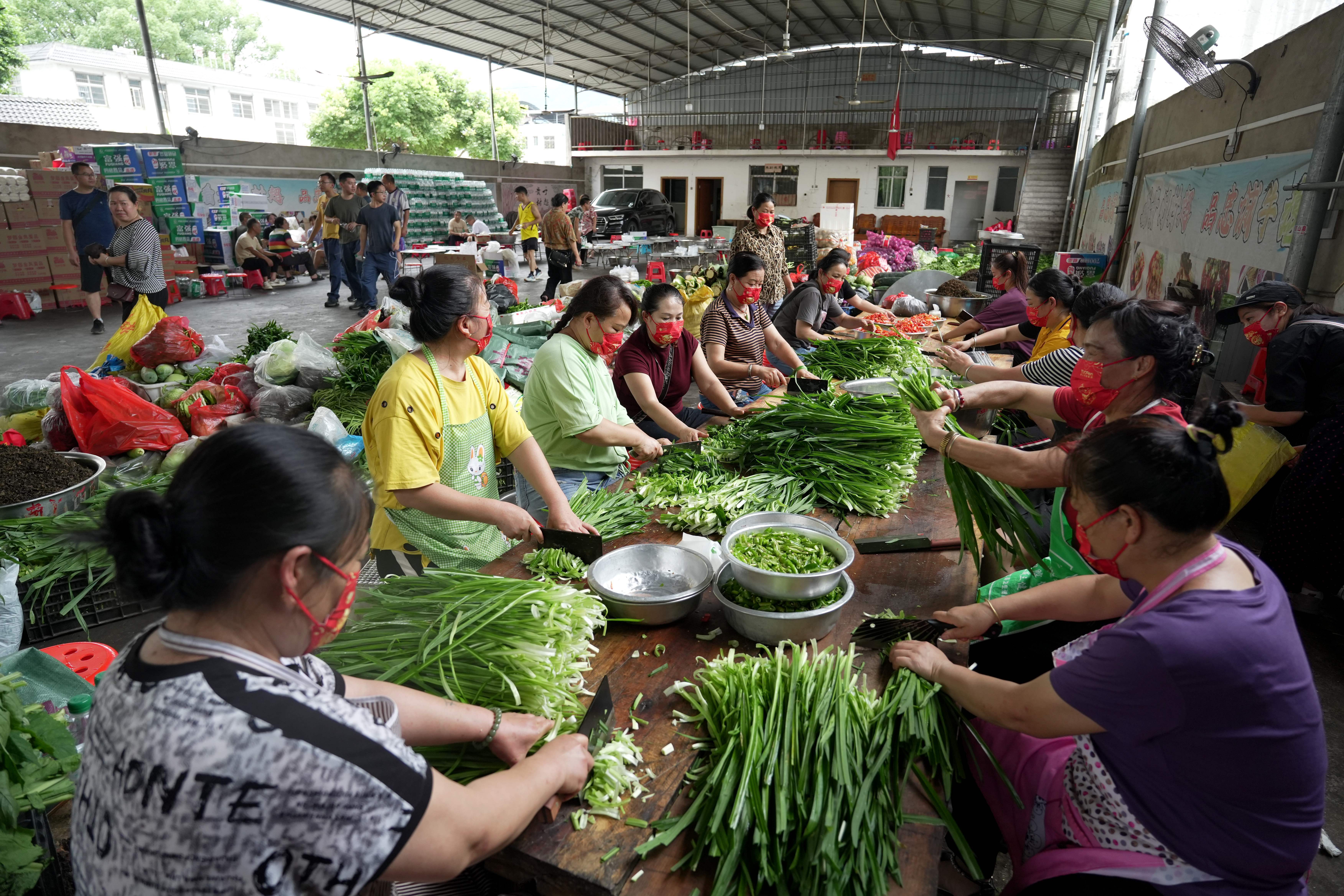 ↑6月26日,村民在贵州省榕江县忠诚镇一处后勤伙食保障点切菜。