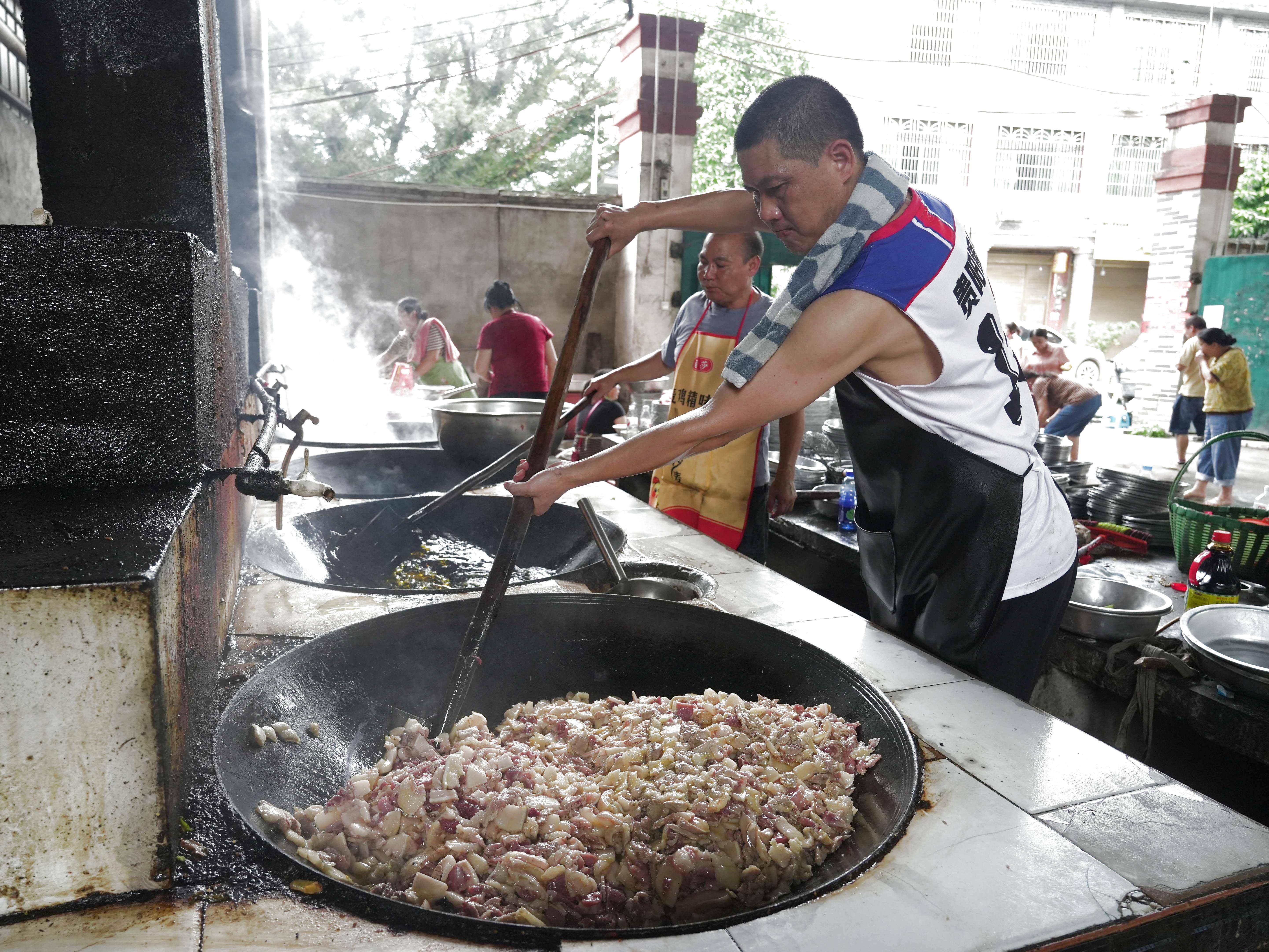 ↑6月26日,村民在贵州省榕江县忠诚镇一处后勤伙食保障点炒菜。